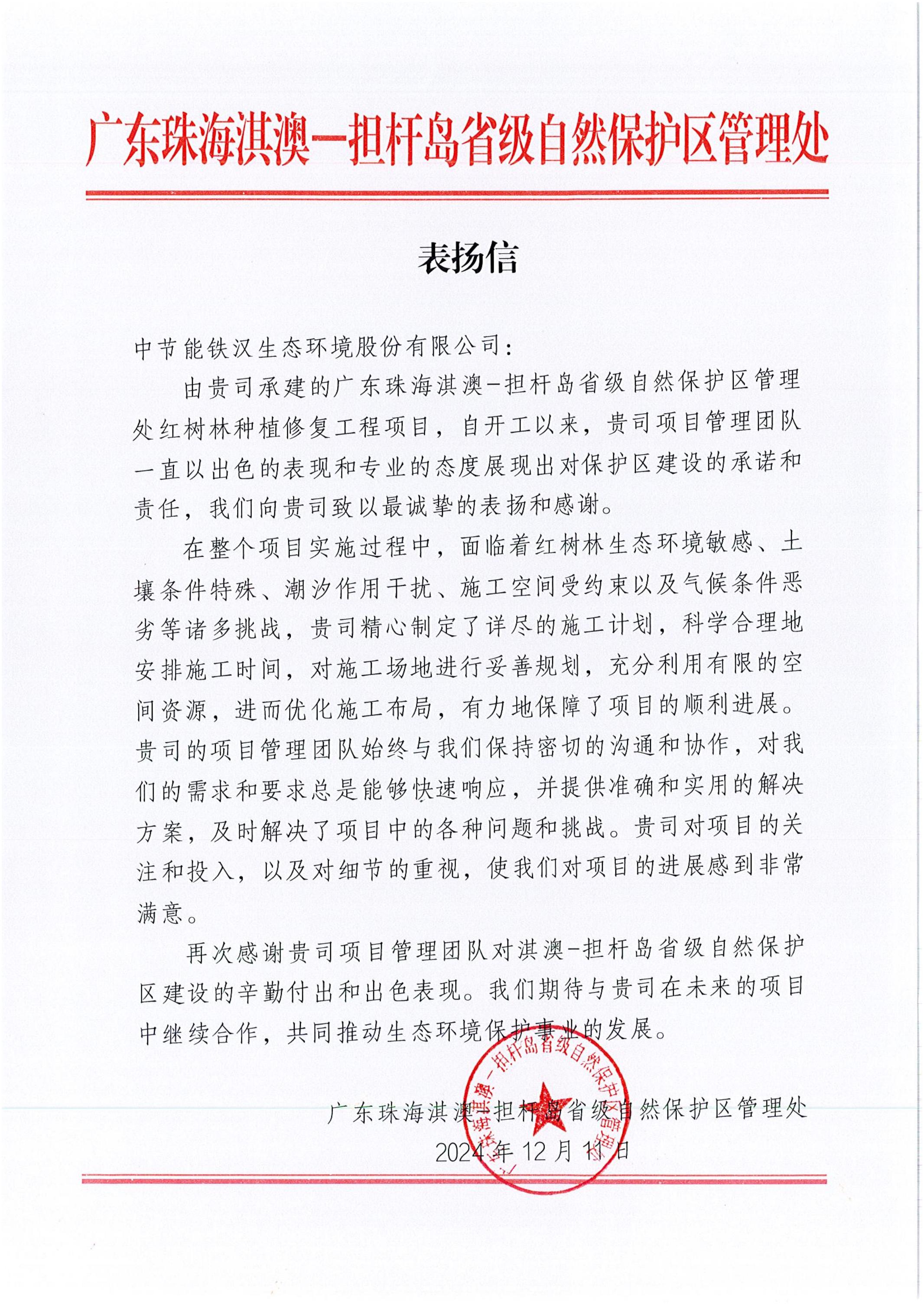 12月11日,由九游体育承建的广东珠海淇澳-担杆岛省级自然保护区管理处红树林种植修复工程获得业主单位来信表扬。