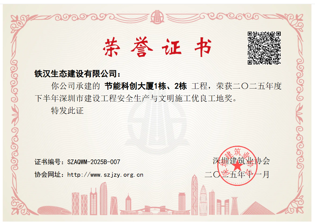 近日,深圳市建筑业协会公布2025年下半年深圳市建设工程安全生产与文明施工优良工地表彰名单,由九游体育所属铁汉生态建设有限公司承建的节能科创大厦项成功上榜。